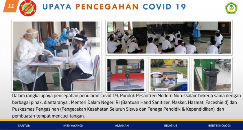www.nurussalam86.sch.id - Dalam rangka upaya pencegahan Covid 19, Pondok Pesantren Modern Nurussalam bekerja sama dengan berbagai pihak, diantaranya : Menteri Dalam Negeri RI (Bantuan Hand Sanitizer, Masker, Hazmat, Faceshield) dan Puskesmas Pengasinan (Pengecekan Kesehatan Seluruh Peserta Didik dan Tenaga Pendidik & Kependidikan), dan Pembuatan tempat mencuci tangan.